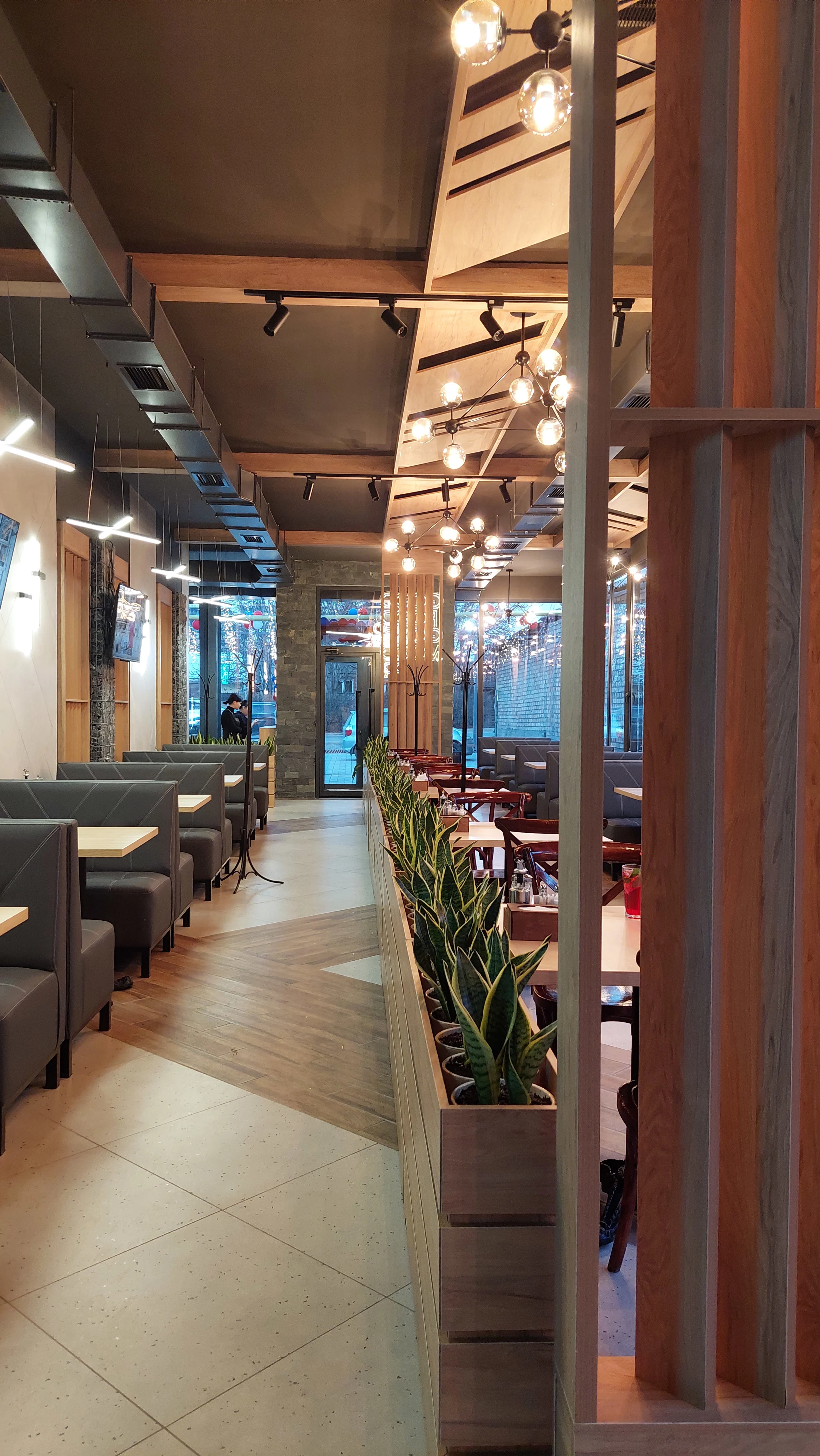 Сделать интерьер кафе с нуля. Пожелание заказчика- тёмный камень, светлое дерево, фанера, тёмные стены. Интерьер должен быть уютным, но в рамках бюджета. Качественная отделка в приоритете, так как заведение должно быть рассчитано на большую проходимость