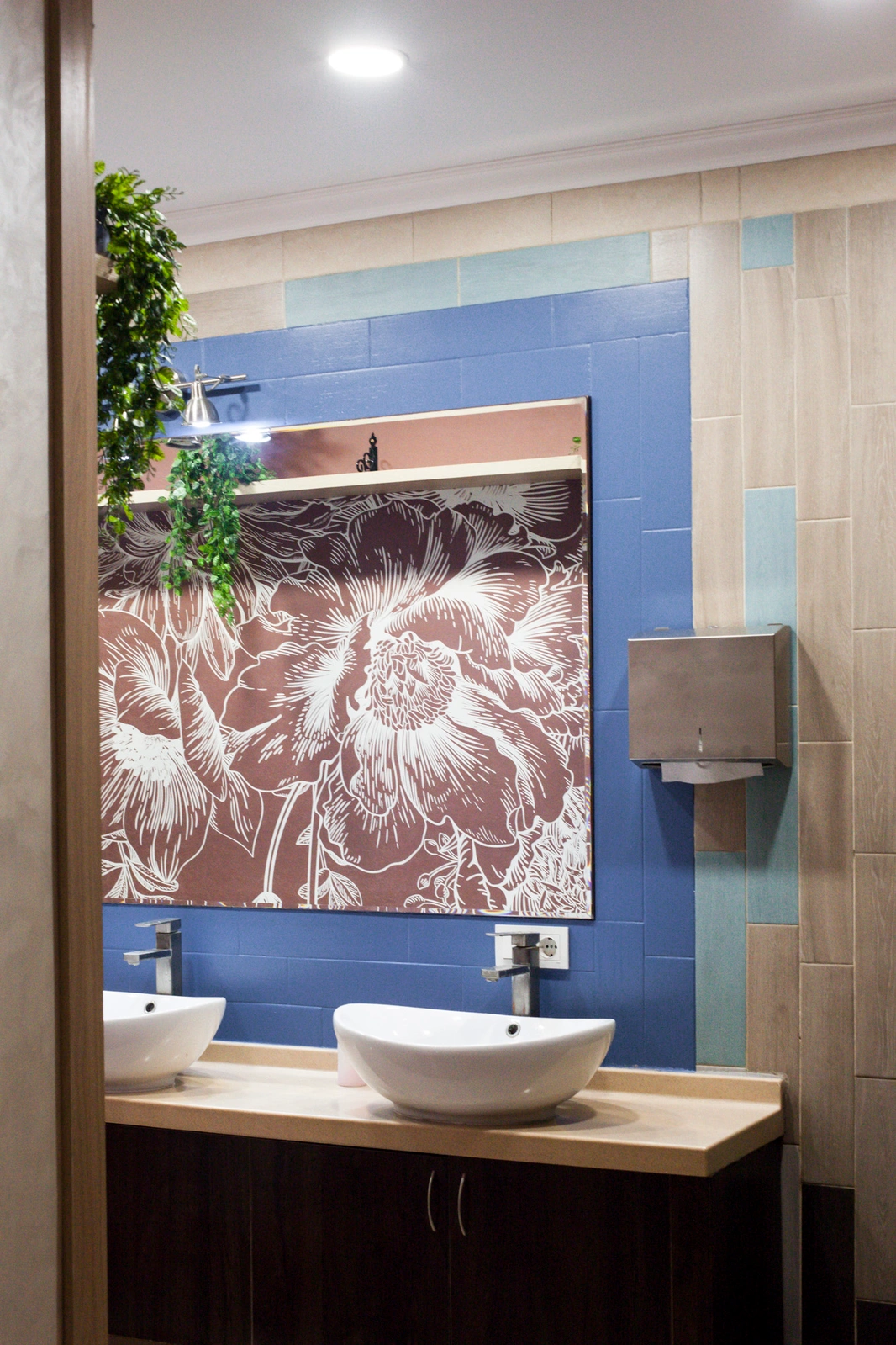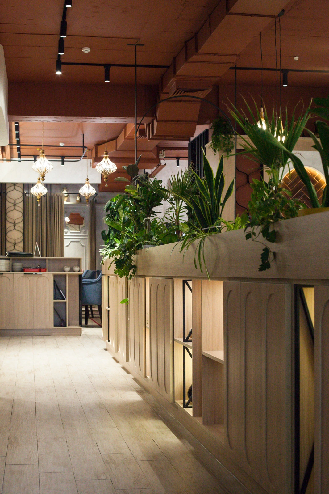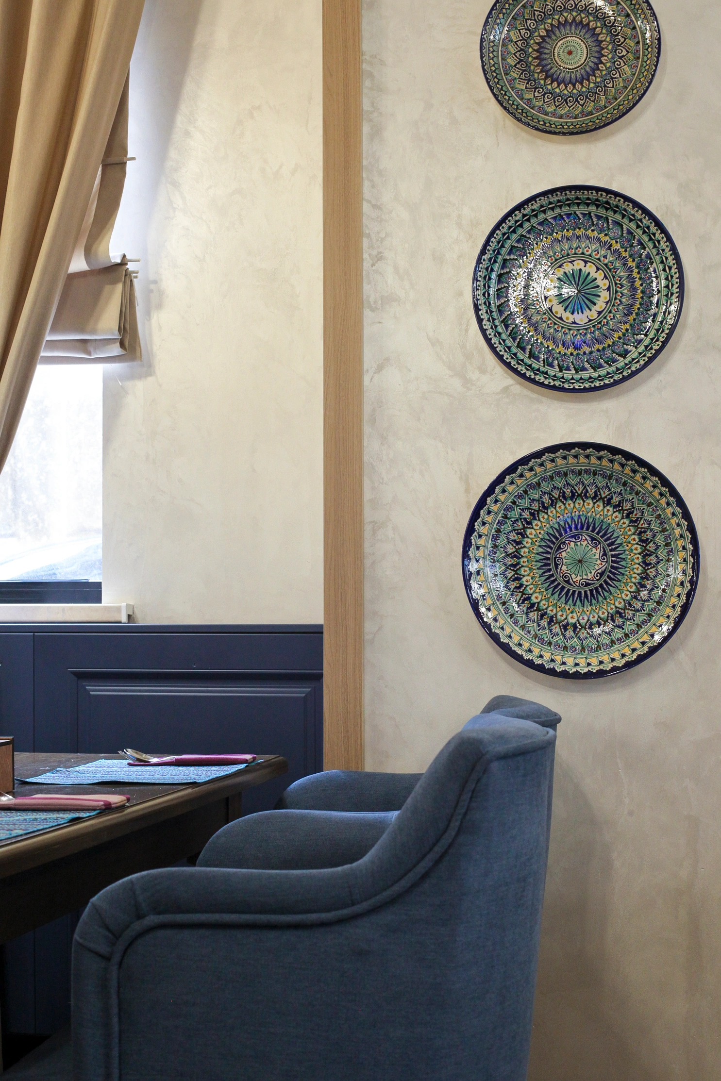 Убрали потолок и выкрасили верхнюю часть интерьера в яркий цвет, что визуально позволило «скрыть» вентиляцию и увеличить количество «воздуха» в интерьере. Добавили декоративной лепнины с подсветкой , что привнесло уют. Текстуры и яркие цветовые сочетания были добавлены по рефернсам от заказчика и отвечают национальному стилю. Максимально сохранили старую мебель, люстры и частично отделку, что позволило оптимизировать бюджет на ремонтные работы