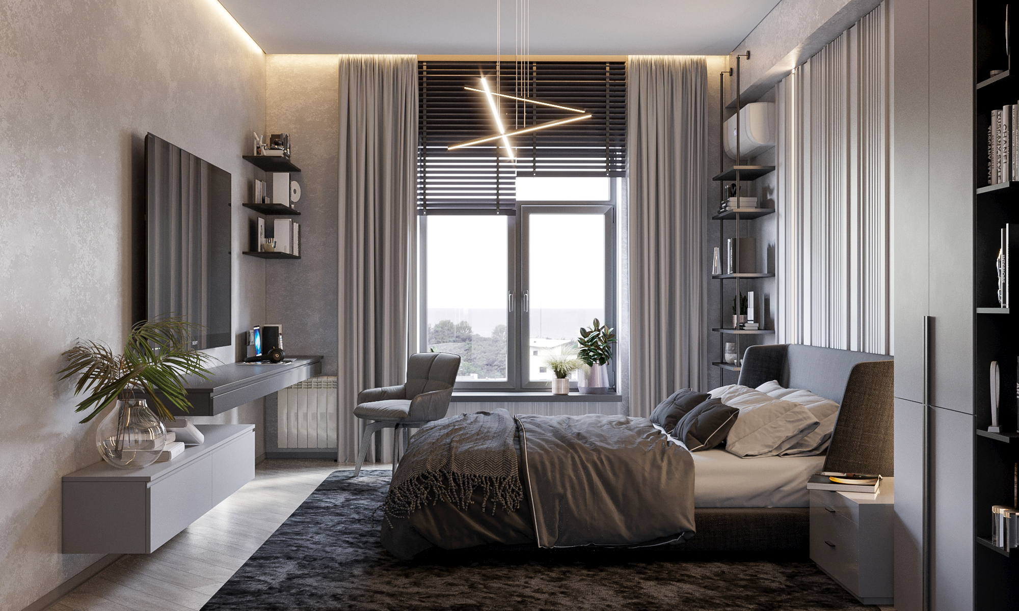 Подобрали не только отделочные материалы, но и мебель, которая точно есть в наличие. Оставили декоративную стену в кирпиче, чтобы подчеркнуть индивидуальность проекта и аутентичность старого дома. Кровать и кухня были разработаны индивидуально под особые размеры. С учётом высокого роста заказчика. Светильник были доставленны по дизайну на заказ из Китая.
