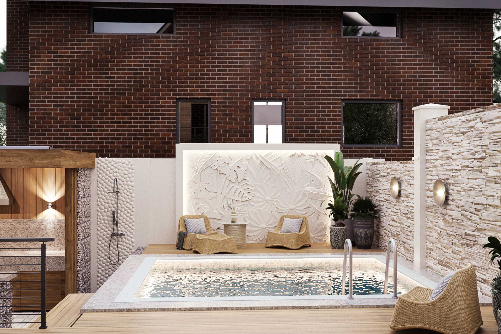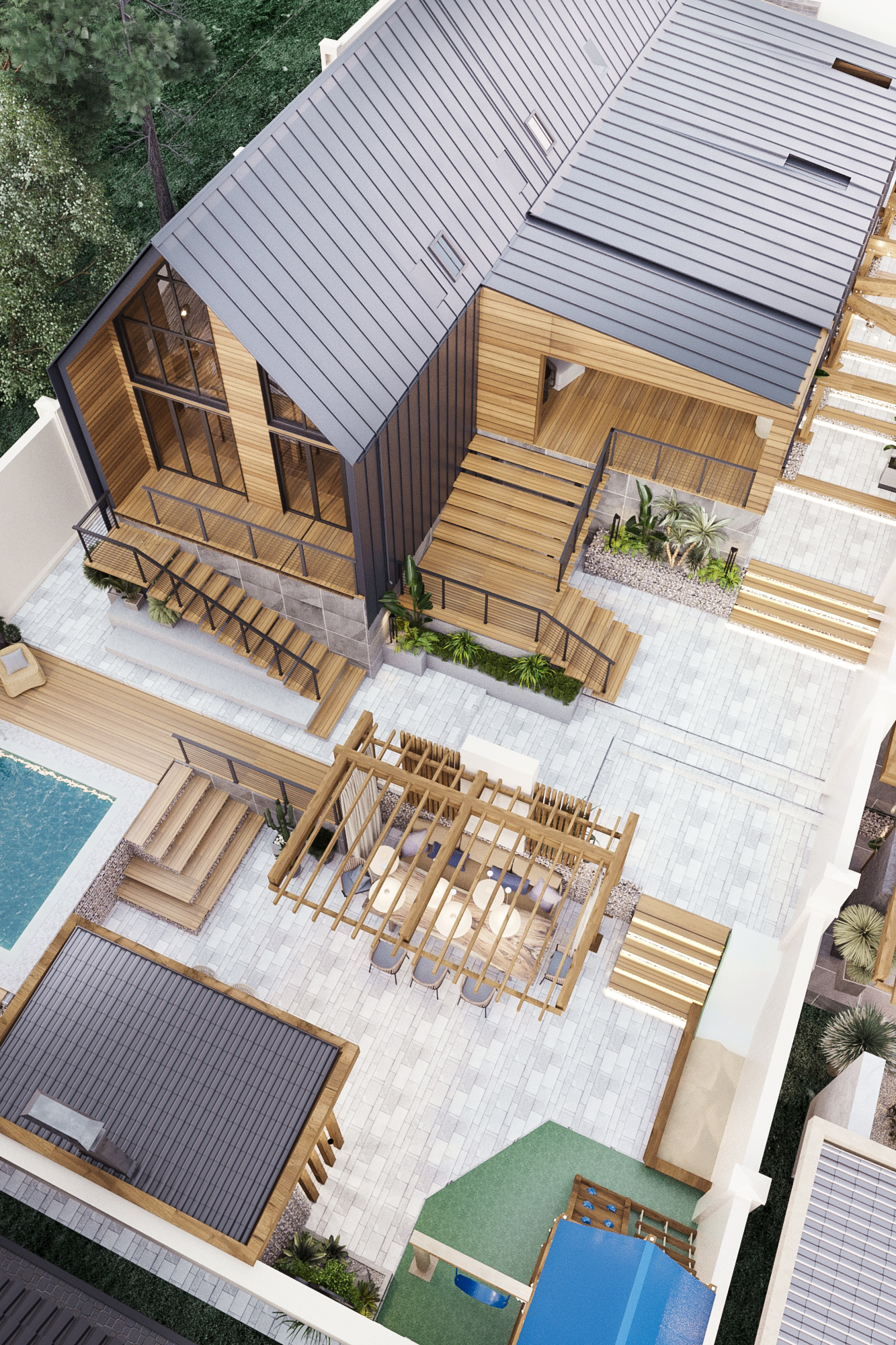 Подчеркнули разность рельефа за счёт габионов. Так же используем их в качестве инструмента зонирования. Разработали перголы как элемент разделения зон. Все конструкции строятся за счёт одного шаблона, что удешевит реализацию в последствии. Проработали световой дизайн. Три уровня освещения сделают территорию более уютной. Используем подсветку ступеней, уличные светильники и и настенные бра в зоне бассейна.