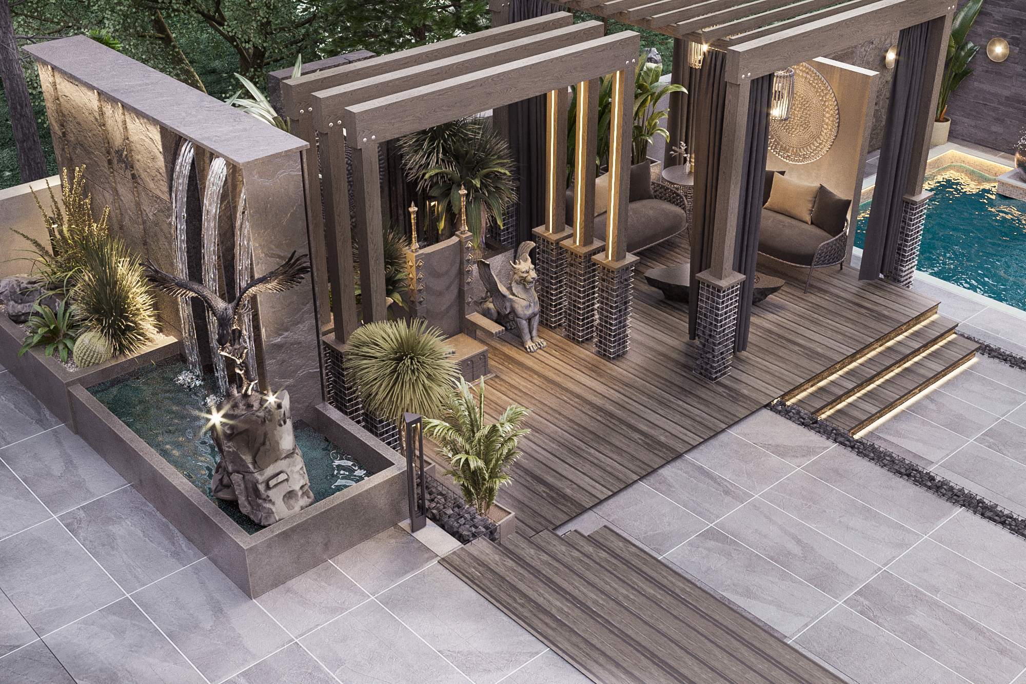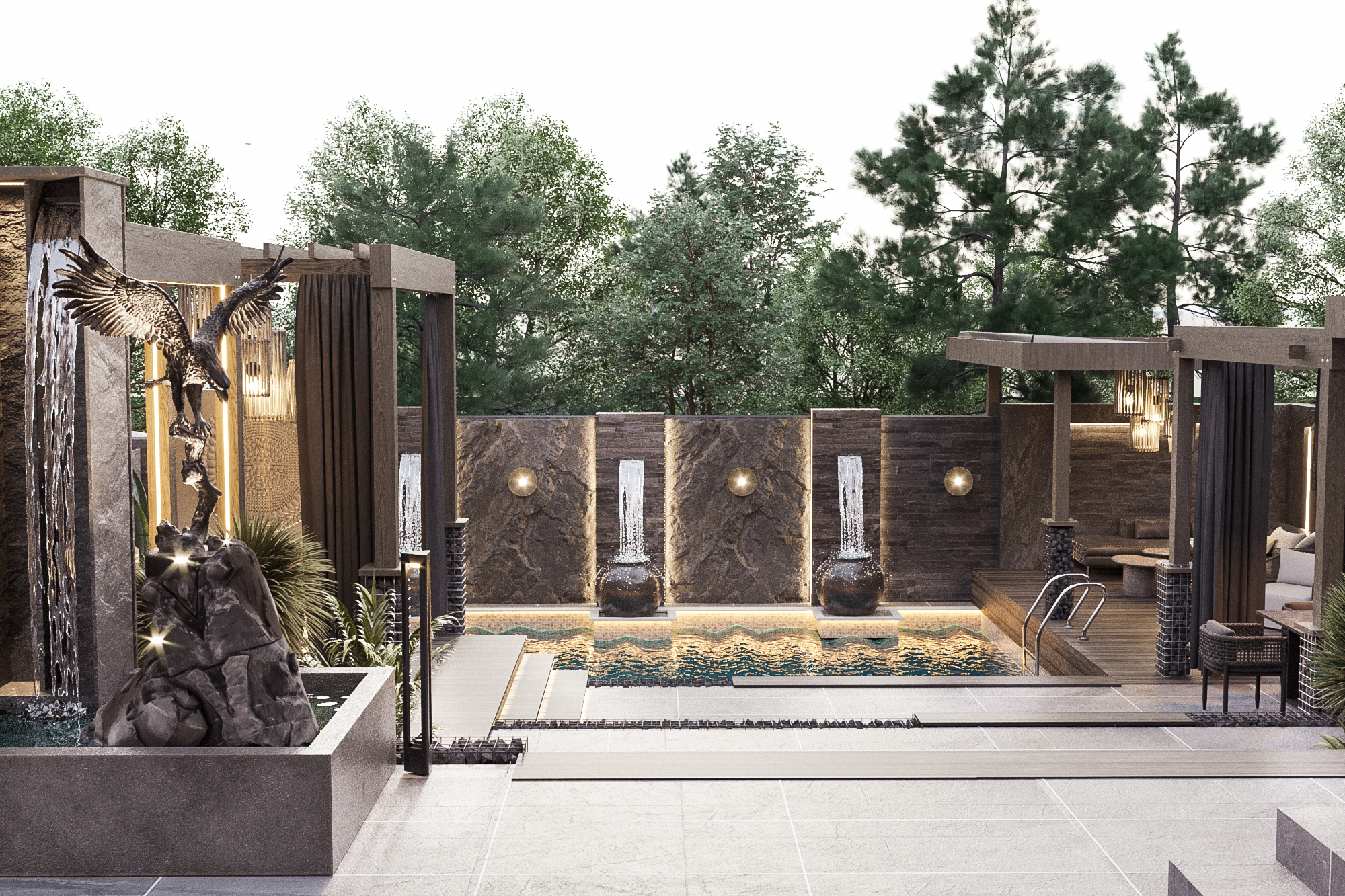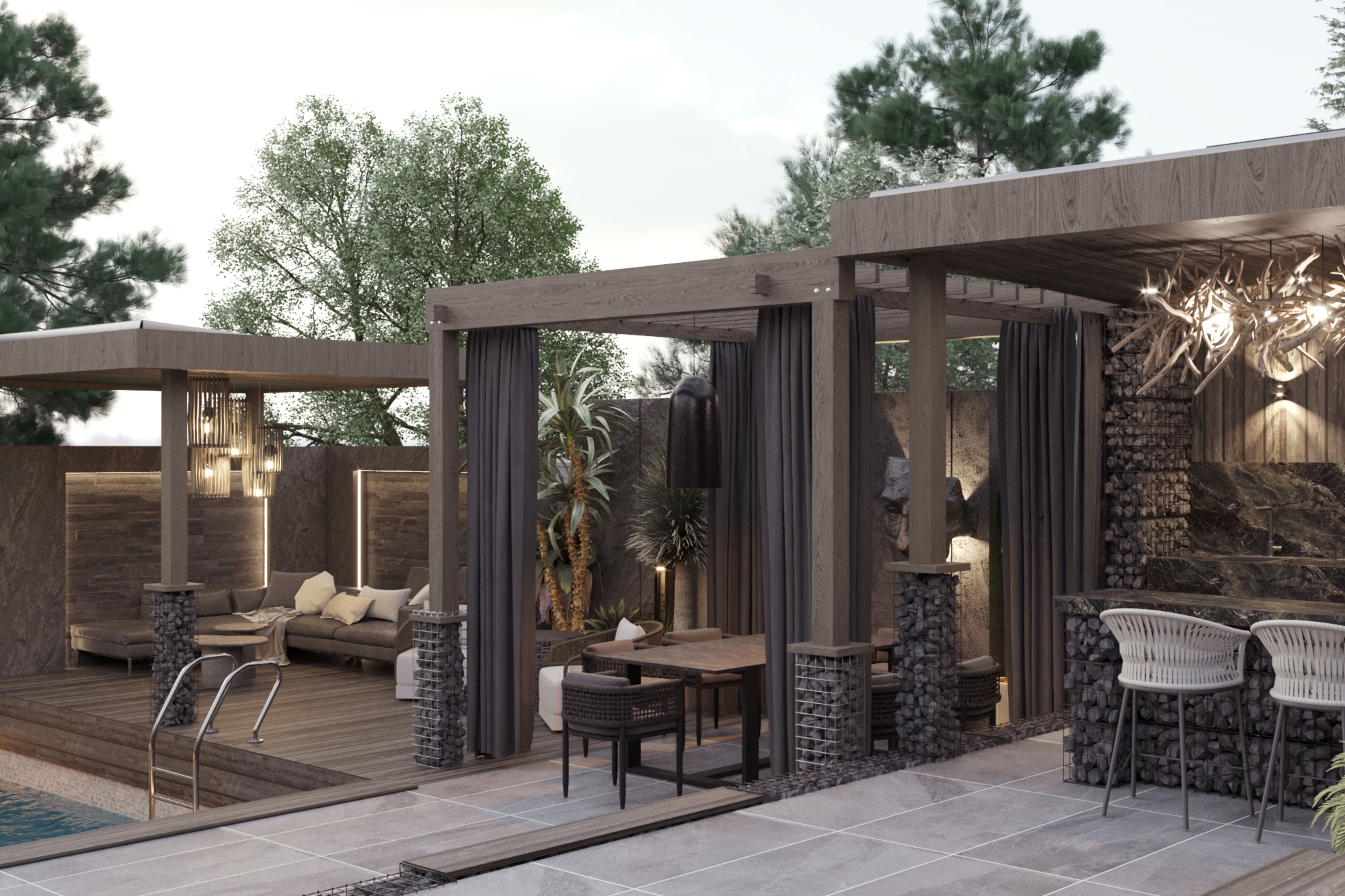 Подчеркнули разность рельефа за счёт габионов. Так же используем их в качестве инструмента зонирования. Разработали перголы как элемент разделения зон. Все конструкции строятся за счёт одного шаблона, что удешевит реализацию в последствии. Проработали световой дизайн. Три уровня освещения сделают территорию более уютной. Используем подсветку ступеней, уличные светильники и и настенные бра в зоне бассейна. Так же добавили скульптурные композиции, которые станут отличительной чертой для места отдыха и узнаваемой фишкой.