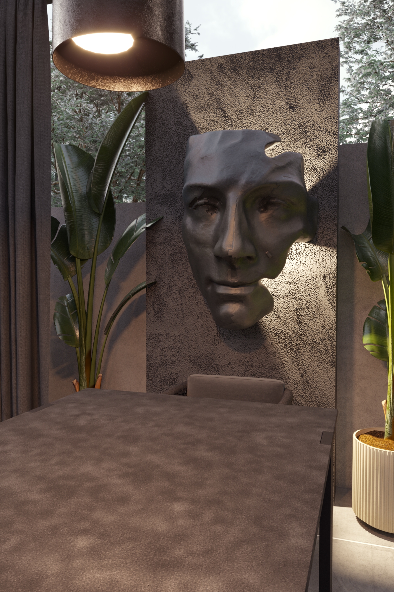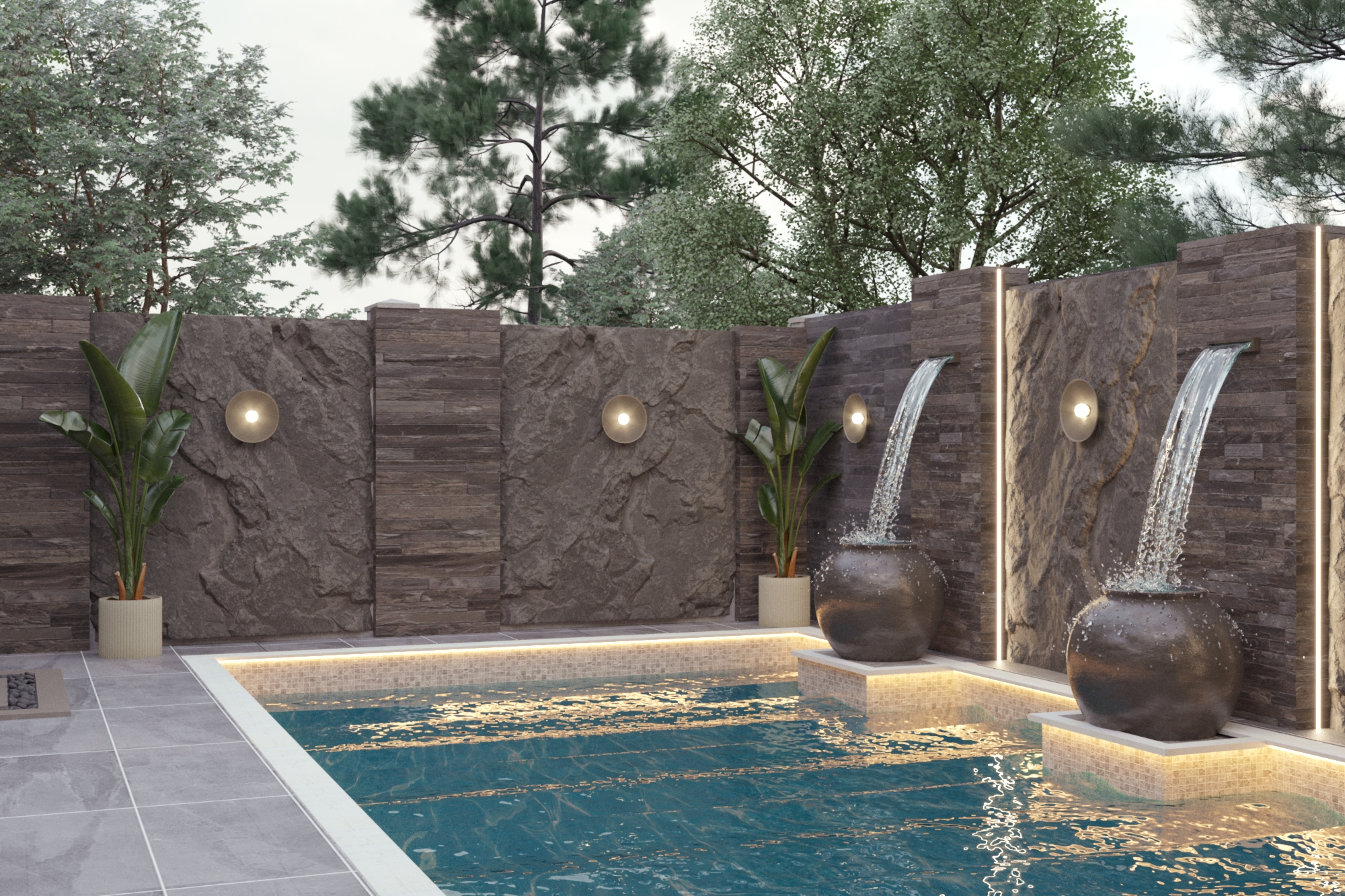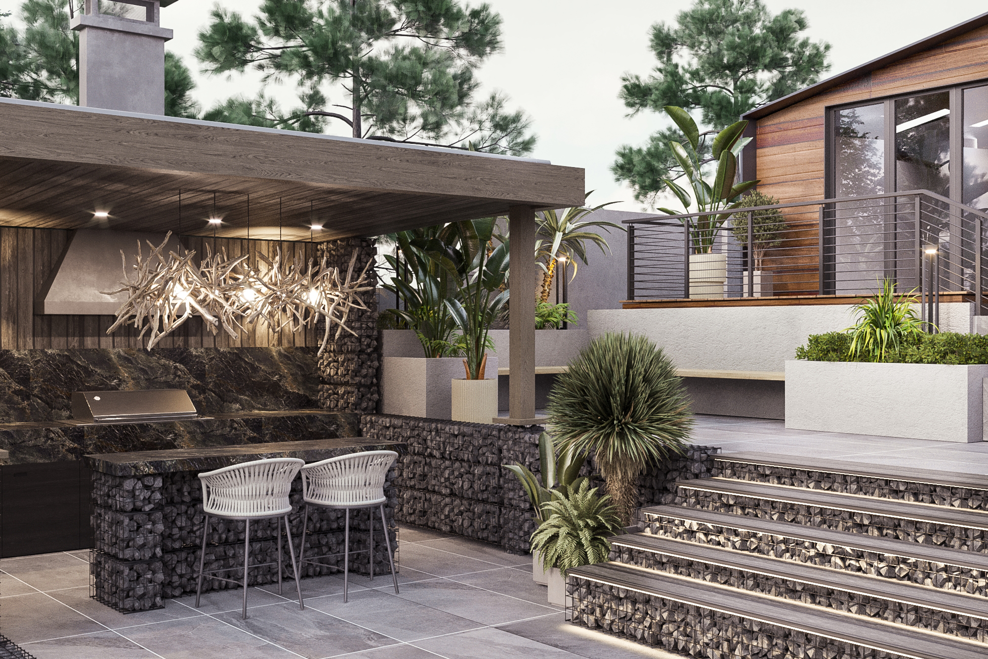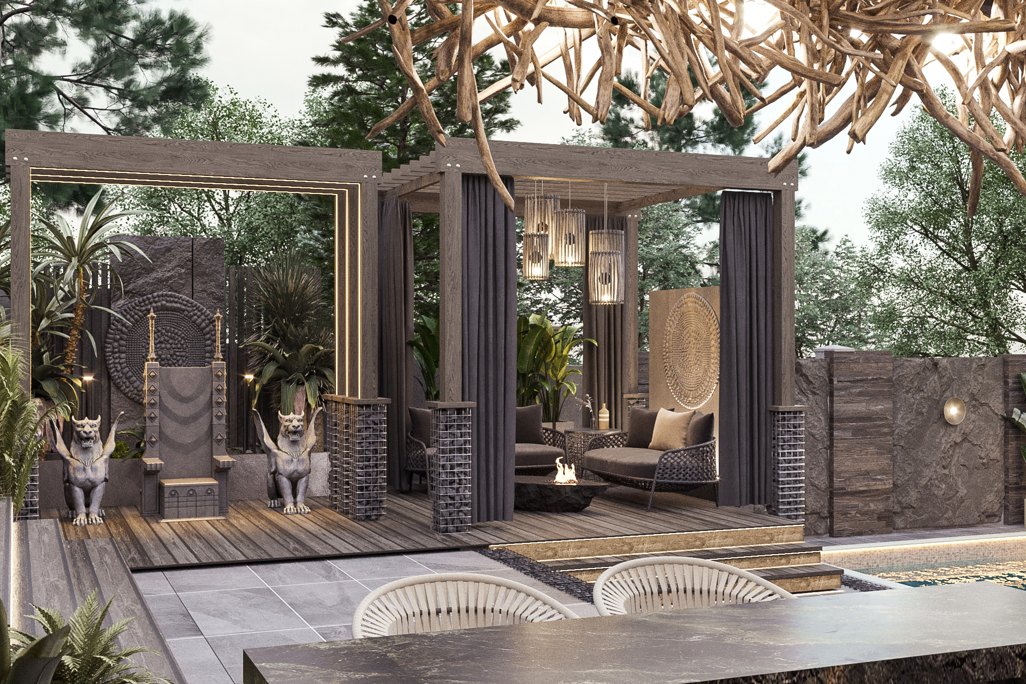 Подчеркнули разность рельефа за счёт габионов. Так же используем их в качестве инструмента зонирования. Разработали перголы как элемент разделения зон. Все конструкции строятся за счёт одного шаблона, что удешевит реализацию в последствии. Проработали световой дизайн. Три уровня освещения сделают территорию более уютной. Используем подсветку ступеней, уличные светильники и и настенные бра в зоне бассейна. Так же добавили скульптурные композиции, которые станут отличительной чертой для места отдыха и узнаваемой фишкой.